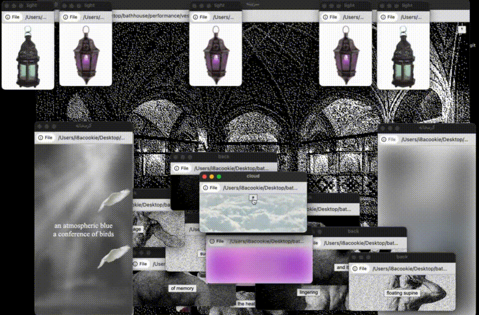This hyper-textual live performance reimagines the traditional Iranian bathhouse within the browser window, where the changing room is a chatroom and spiritual ablution is an ambient ritual. The artist navigates the bathhouse by clicking, typing, reciting, and gesturing, transforming their desktop into a site of intimacy without physical proximity. Blending poetry, archival practice, and internet art performance, this piece explores the protocols of the hammam and questions how one might create what Amiri Baraka called a “spiritually‑oriented technology.”